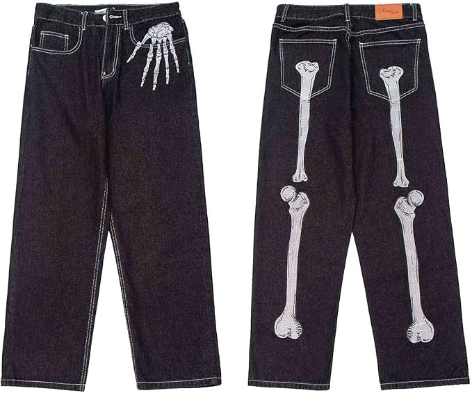 Hip Hop Jeans Dark Black Skeleton Embroidery Jeans Gothic Loose Wide Leg Straight Leg Trousers Grunge Clothes