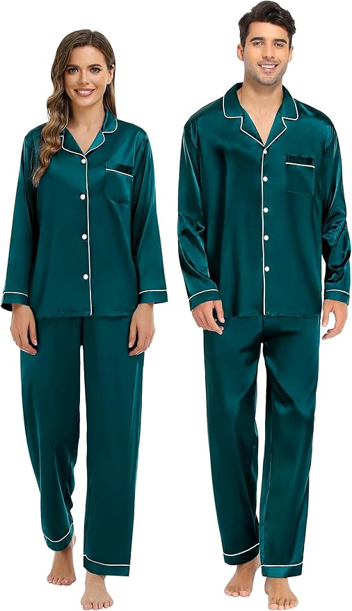 Couple Matching Pajamas Set Silk Satin Button Down Sleepwear Long Sleeve Nightwear 2 Pcs Pj Set