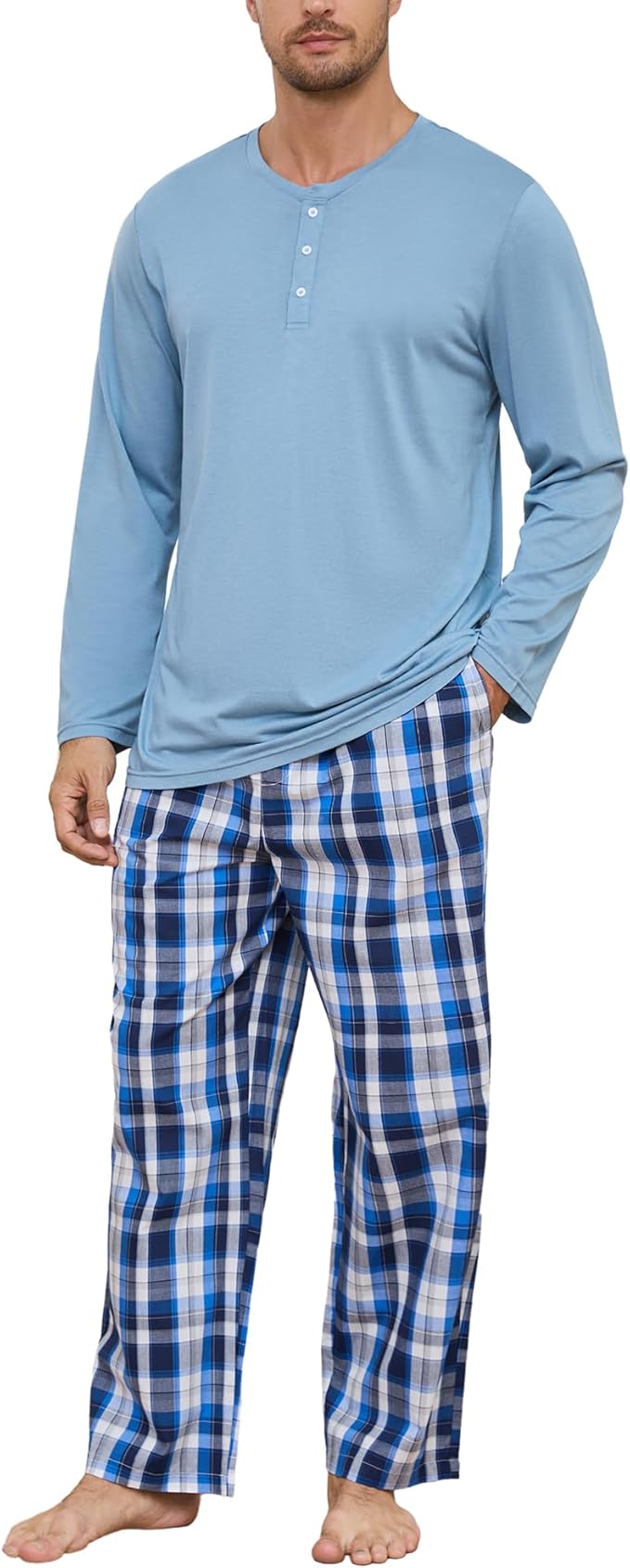 Mens Pajama Set Long Sleeve, Pajamas Made from Bamboo Pulp Viscose and Cotton Lightweight PJS for Men