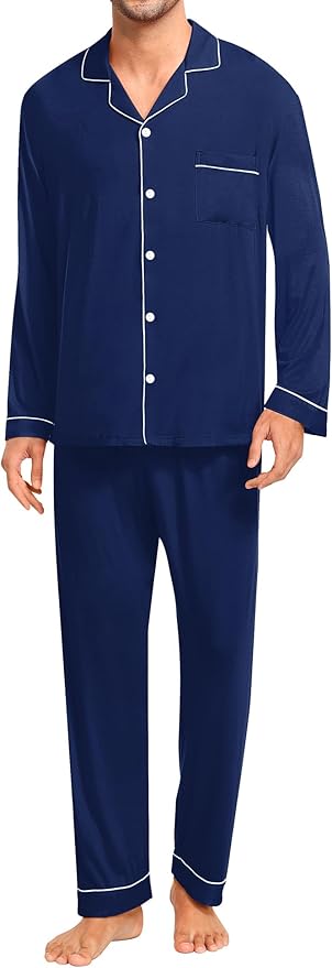 Men Pajamas Set Comfy Modal Pjs Button Down Sleepwear 2 Piece Long Sleeve Lounge Set Soft Nightwear with Pockets