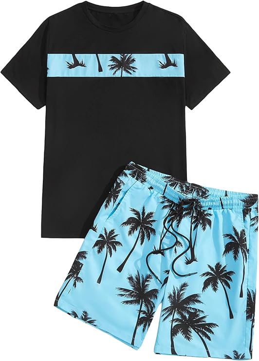 Men's 2 Piece Outfits Letter Graphic Print Short Sleeve Tee and Drawstring Waist Shorts Set
