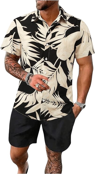 Men's Hawaiian Matching Set Summer Beach 2 Piece Outfits Flower Button Down Shirts and Shorts Set